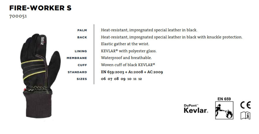 ถุงมือดับเพลิง (Firefighter Glove) ยี่ห้อ SEIZ รุ่น FIRE WORKER S มาตรฐาน EN659
