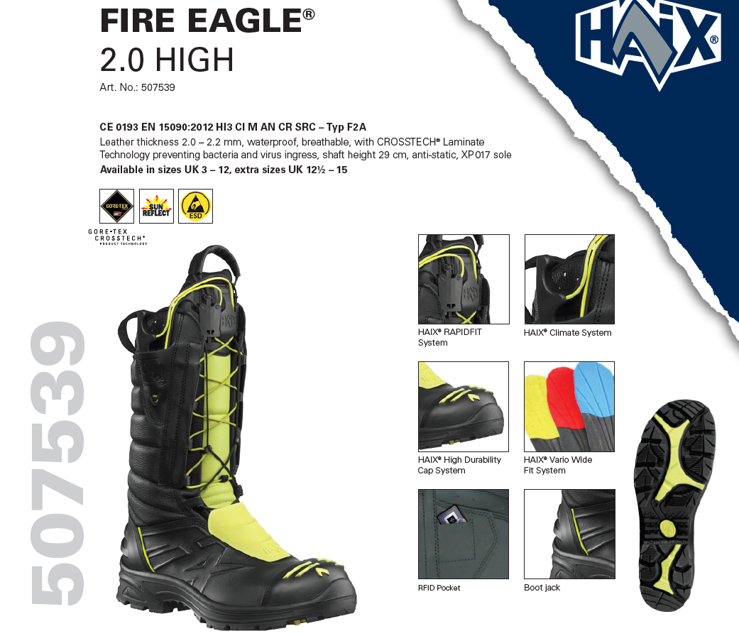 รองเท้าดับเพลิง (Firefighter Boots) ยี่ห้อ HAIX รุ่น FIRE EAGLE2.0 high มาตรฐาน EN15090 วัตถุประสงค์ : ไว้ใช้ในงานดับเพลิงภายในอาคารและงานกู้ภัย การให้ความช่วยเหลืออุบัติเหตุ และระงับเหตุเพลิงไหม้ในหน่วยงานหรือพื้นที่ใกล้เคียง และใช้ในการฝึกอบรมดับเพลิงให้กับพนักงานของหน่วยงาน