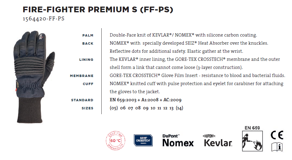 ถุงมือดับเพลิง (Firefighter Glove) ยี่ห้อ SEIZ รุ่น PREMIUM S มาตรฐานEN659