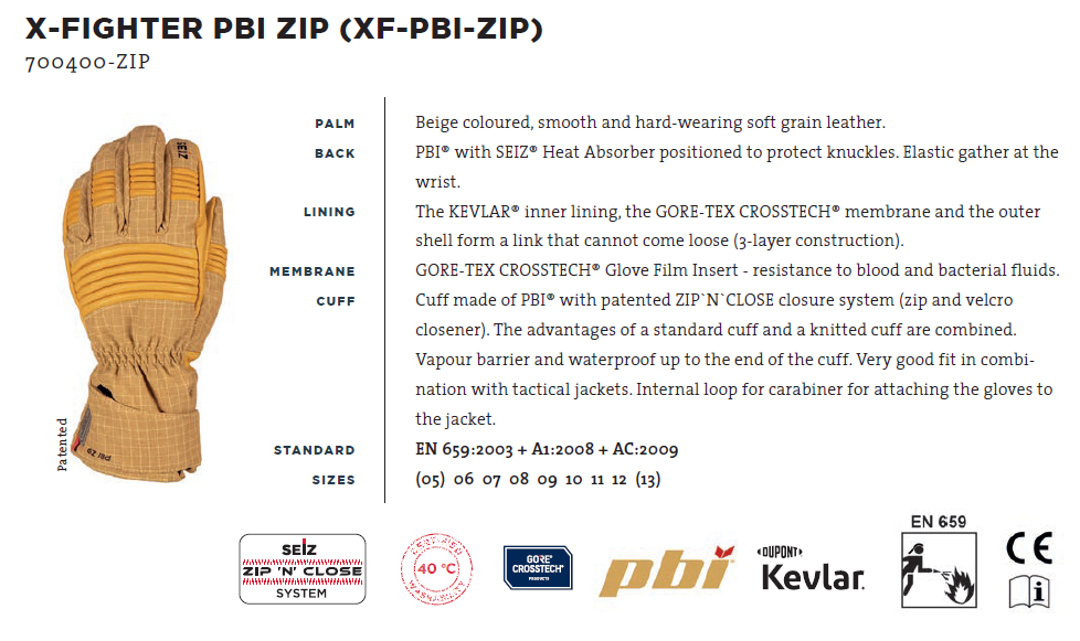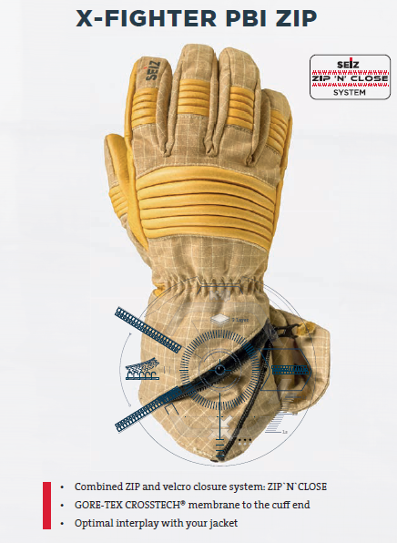 ถุงมือดับเพลิง (Firefighter Glove) ยี่ห้อ SEIZ รุ่น X-FIGHTER PBI ZIP (XF-PBI-ZIP) มาตรฐานEN659
